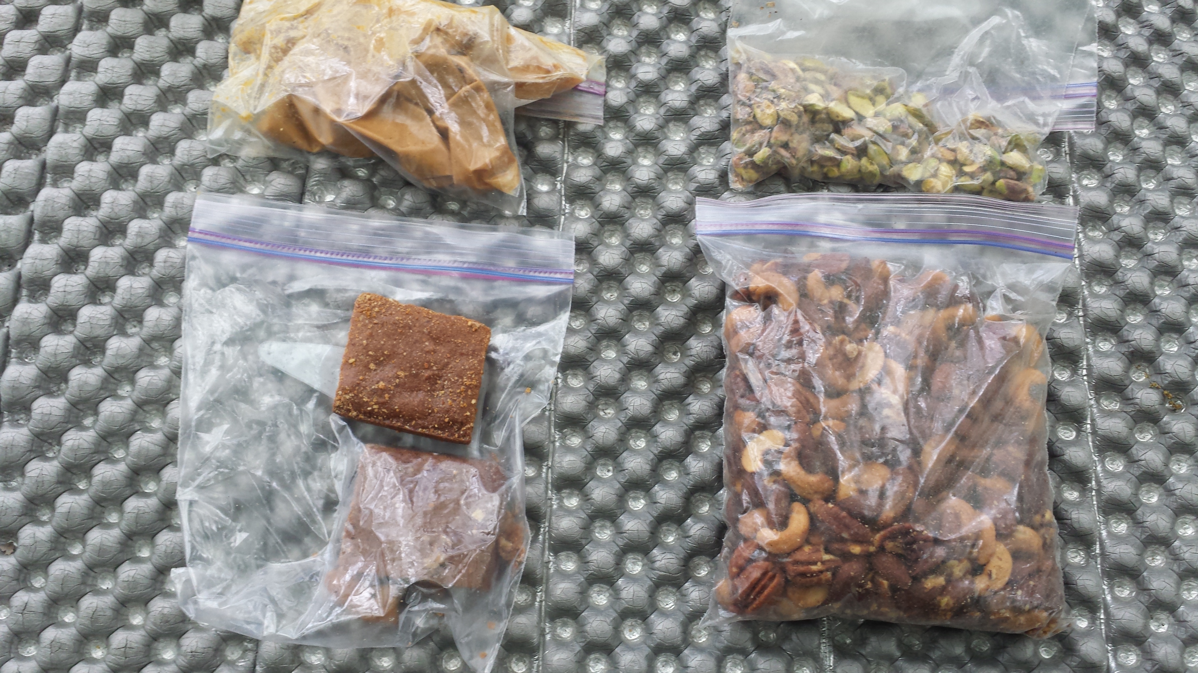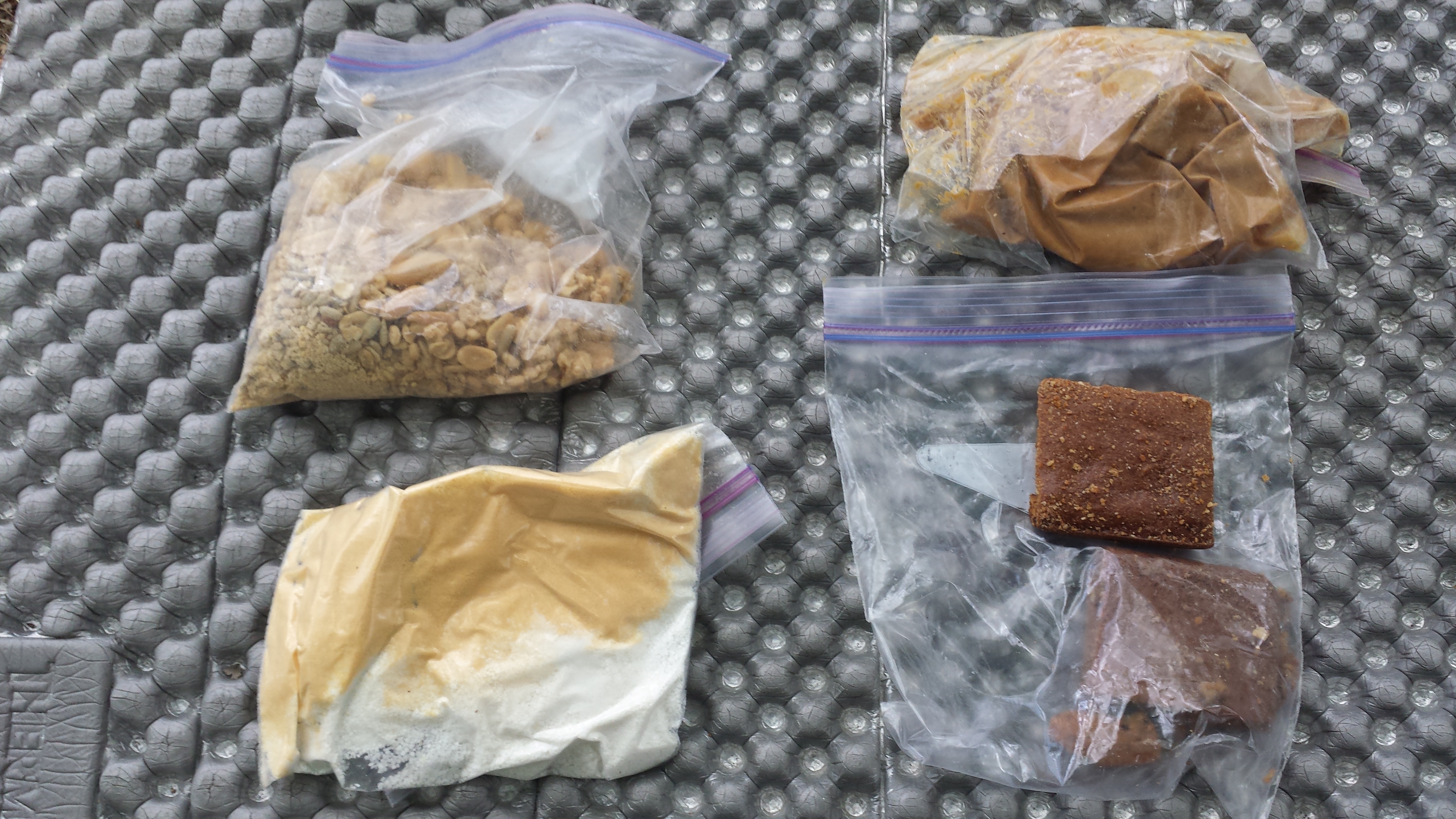 On the bottom left is instant grits with some powdered “Ova Easy” eggs; above that is granola. I would have either but not both. On the right bottom is a square of a high calorie quick bread Ann baked and dehydrated for me. Top right is peanut butter in bags (since the jars are heavier and don’t compact as they are emptied). This and water usually make up my breakfast.