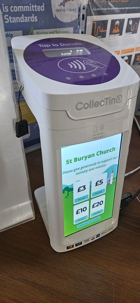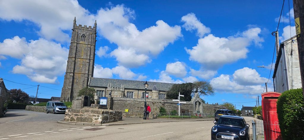 I started walking at 1:18 pm. Walked through farmland most the day. And arrived at St Buryan around 3:15. The Anglican church there is open all day to visitors, so I went in and prayed, took a few photos of the interior, walked a little of the graveyard, and then sat on a bench outside having snacks.