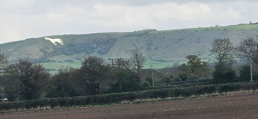 I’m learning to be flexible. A slow train also allows better photos out the window, like this one of the Westbury White Horse.