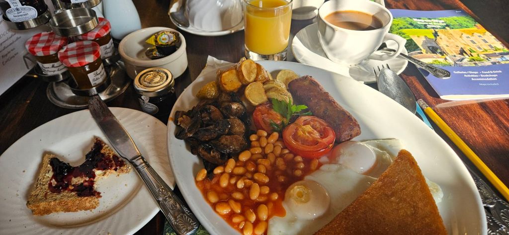 I spent much of the day wandering from shop to shop … with a break in a cafe for coffee and an ice cream covered brownie. That was my lunch, as I was still fairly full from my B&B “vegetarian full English breakfast.”