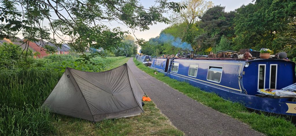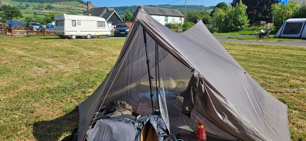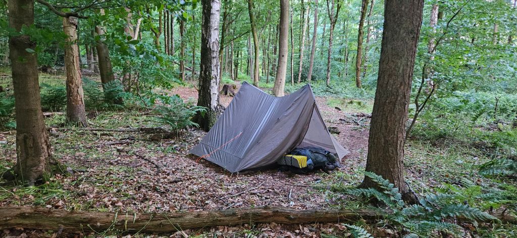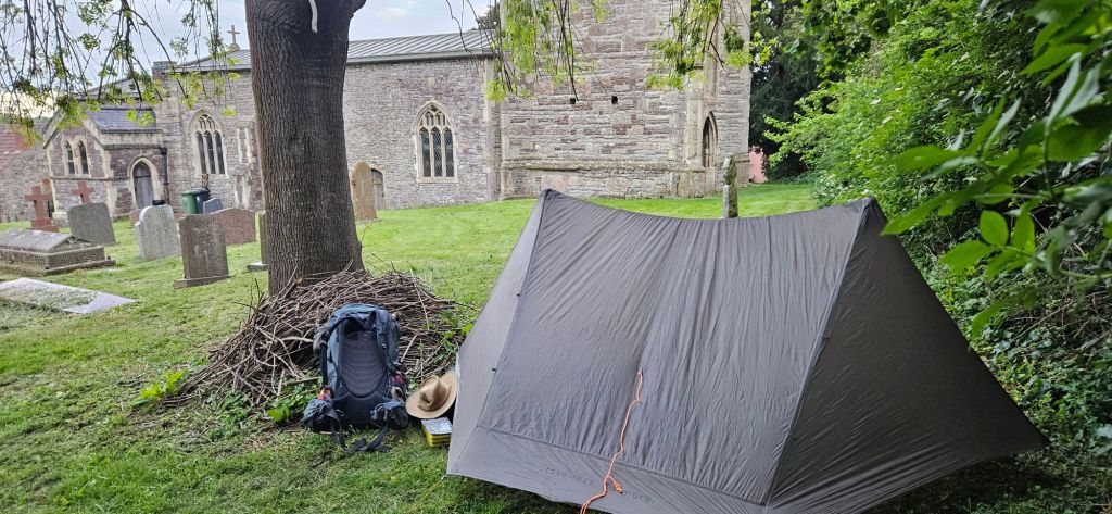 I have wild camped (sometimes with permission, sometimes without) in a neglected corner of a farmer’s field; behind a historic mill run by the National Trust; between a tree and a stone wall in a church cemetery; next to the chimney remains of an old mine in what is now a wildlife preserve; along a canal towpath; in the woods at a far corner of a “country park”; in a fenced village green space between a small stream and a sheep meadow; several times in the porch at the south side of rural churches; and so on. Pretty much every night is different.